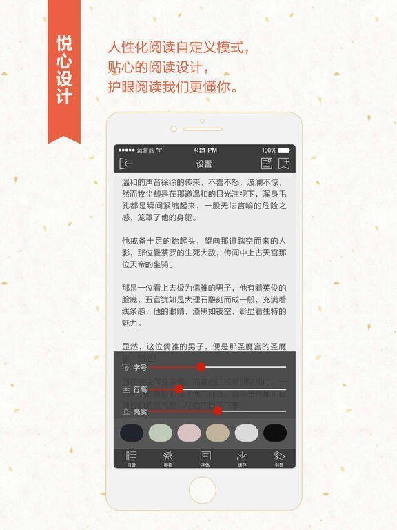 4. 操作个性:书签、续读、设置等功能让阅读更具个性化。