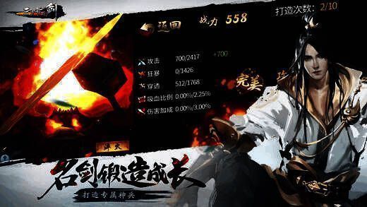 支持名剑锻造成长,打造专属神兵。运用3D touch技术,还原古法铸剑工艺,通过吹气感应炉火温度。玩家可化身强大铸剑师,自主掌控材料选取、火候把握、淬火温度,亲手锻造莫邪、赤霄、长生等传说名剑,实现人剑合一,迈向剑道巅峰。