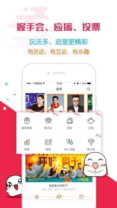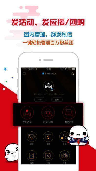它是集精彩线上线下活动(像粉丝见面会、握手会)、粉丝团应援、投票、互动、独家粉丝福利、周边、演出票、明星资讯美图视频资源等功能于一体的粉丝交流互动平台(APP + 网站)。同时配备便捷强大的粉丝团管理、应援活动饭制商品发布管理、宣传海报制作等工具,助你轻松组织粉丝应援活动、制作分享爱豆精美宣传海报,还有不定期明星握手会,快来开启愉快追星之旅!