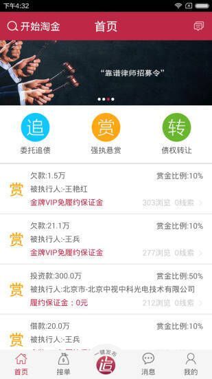 当事人可免费发布追债、悬赏、转让需求,汇聚海量案源。