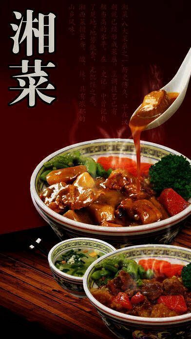 湖南菜即湘菜,有“辣味烈性一相逢,便胜却人间无数”之美誉,是汉族饮食文化八大菜系之一,以湘江流域、洞庭湖区和湘西山区三种地方风味为主。其风味特色为辣味菜和腊味菜,制作精细、用料广泛、口味多变、品种丰富;色泽上油重色浓,追求实惠;口味注重酸辣、香鲜、软嫩;制法以煨、炖、腊、蒸、炒等闻名。