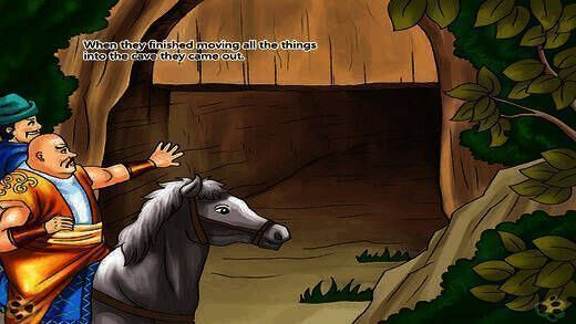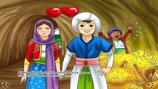《阿里巴巴和四十大盗》的故事里,樵夫阿里巴巴在砍柴途中意外发现了强盗集团的藏宝地。强盗们为绝后患,密谋杀害阿里巴巴。好在他得到了聪明机智、嫉恶如仇的女仆莫吉娜的帮助,最终化险为夷,还战胜了强盗。这个故事启示我们要成为充满智慧的人。