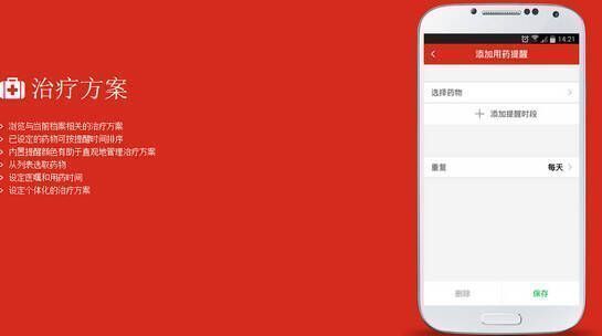 3、治疗方案:可浏览与当前档案相关的治疗方案,已设定药物按提醒时间排序,内置提醒颜色便于直观管理;能从列表选取药物,设定医嘱和用药时间,定制个体化治疗方案。