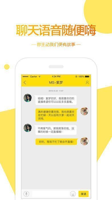 3、文字、语音畅快聊天:发现喜欢的美女后,除了进行一对一视频聊天,还能发起文字和语音聊天。