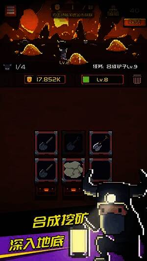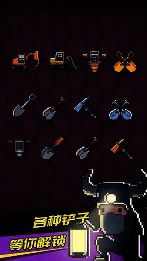 该游戏由 Lemon Jam 推出,是像素风格的冒险放置类手游。玩家操控矿工开采矿坑,挖掘不同矿石出售换金币,或用矿石素材打造、升级工具。还能用金币雇佣更多矿工,深入挖掘收集黄金,成为矿产大亨。