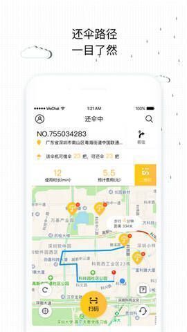 1、预约用伞:在地图上选定即将使用的雨伞,点击预约用伞后还能选择导航。