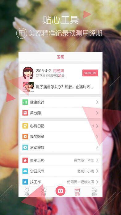 【经期助手,贴心随身宝箱】谁说不来大姨妈就不需要经期助手?高压痘、经前痛、忙碌肥、情绪瘦、孕前准备、孕后休养,哪一项不是姐妹们生活中的重要问题。美荔的大姨妈经期工具能帮你追踪身体状况,准确判断生理健康,预测大姨妈。还有贴心的记账和日记小工具,方便你的生活。