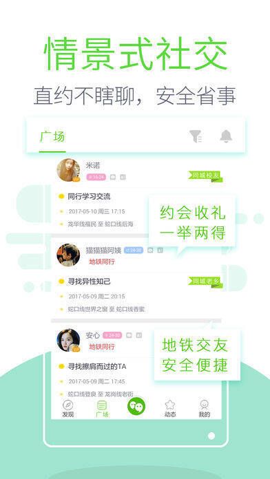 这里是单身人士的爱情介绍所和青年新公社,专注于真实情景式社交,让社交回归现实。它提供同行交友、拼车交友、友情邀约、活动聚会等多种社交方式,直约不瞎聊,多对多选择,让约会变得简单。上下班地铁公交同行交友,安全免费、高效省事不尴尬,是最直接有效的见面相亲方式,相亲找老乡更靠谱。