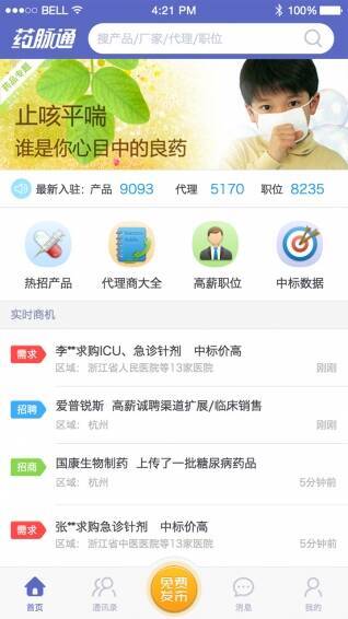 1. 能发布和查询药品、医疗器械的招商信息;2. 可发布和查询代理信息;3. 能发布和查询招聘信息;4. 应用内通讯功能方便维护联系信息。