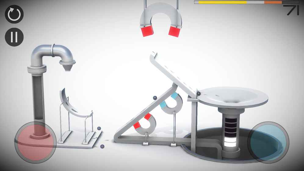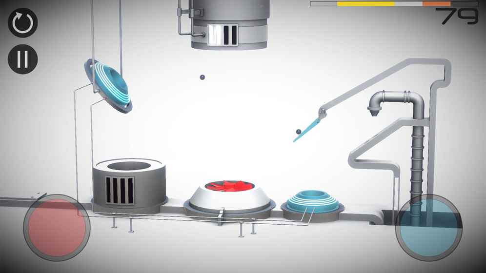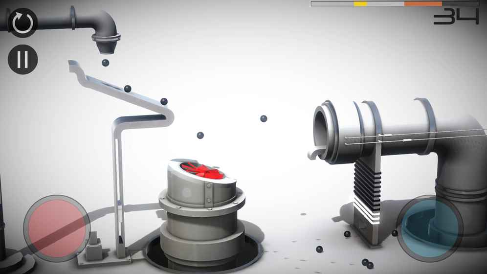 简单来说,玩家的目标是让所有弹珠球都滚入指定位置。路途上分布着多个轨道和机关装置,要启动这些装置,需依靠屏幕下方的两个虚拟按钮。
