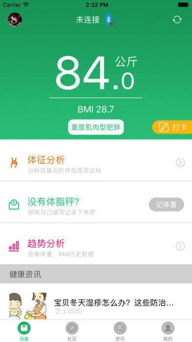 通过蓝牙智能硬件测量健康数据并生成分析报告,支持健康报告功能;可按喜好设置重量单位,如斤、千克、磅;支持添加多成员管理,全家共用;内置健康资讯,可订阅喜欢的内容学习健康知识。