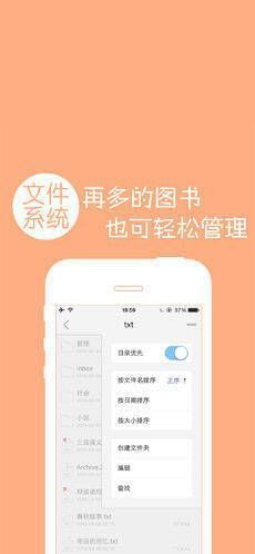 按目录管理图书文件,在目录中可进行搜索(可用关键词、拼音或首字母快速检索)、排序(可按文件名、大小、时间排序)、复制、移动、删除、新建文件夹、重命名、发送邮件(把选中文件通过邮件发送)、OpenIn(通过其他应用打开选中文件)、压缩文件和文件夹(把选中文件和文件夹压缩成zip文件)。