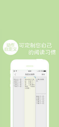 能在屏幕任意区域设置单指和双指的单击、左滑、右滑、上滑、下滑动作。动作类别涵盖上一页、下一页、增大字体、减小字体、增大亮度、减小亮度、显示工具栏、添加或删除书签、打开目录列表、打开备注页、打开文本搜索页、打开解释收藏页、打开系统配置页、关闭图书、自动阅读、语音阅读。
