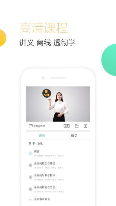 1、百位会计名师同时授课:预习班、基础班、习题班、精讲班、串讲班等班次完美搭配,满足会计从业、注会、会计职称等不同学习阶段的需求。支持同时查看讲义、调节语速、做笔记、音/视频切换,还能下载到本地。