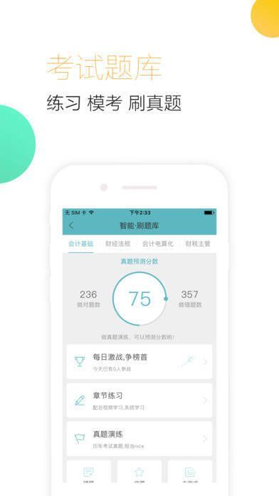 2、专业权威的练习中心:章节练习、知识点练习、网校模拟题、历年真题等均可通过手机实战演练。题型全面精准,贴近考试,能大幅提升应试能力,涵盖会计从业、会计职称、注册会计师等考试。