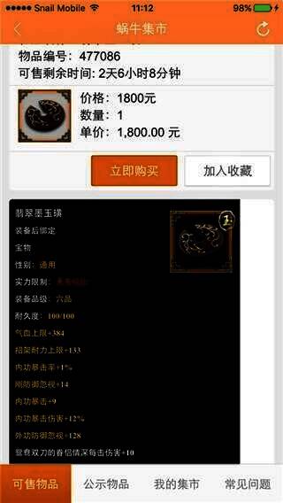 1、打开蜗牛集市,选择自己要购买的物品,选中物品后点击购买按钮。