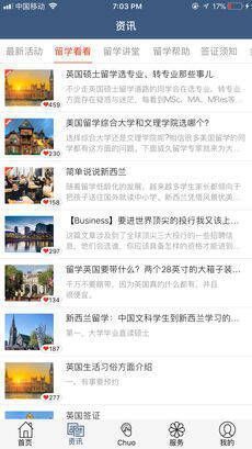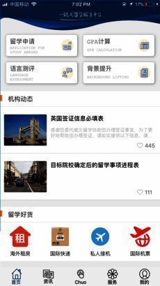 【服务】包含多项留学必备服务。【资讯】网罗各类留学资讯、机构活动分享及重要留学信息发布。【沟通】群组及好友功能方便学生联系机构老师和学长学姐。