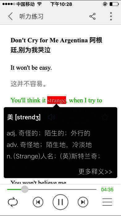 3、拥有简洁实用的听力播放器,支持跟读和点播;