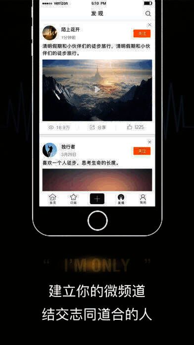 3、我的创作:通过手机端编辑短视频,一键上传、实时分享,轻松创建自频道,简单发布与推广,轻松当网红。