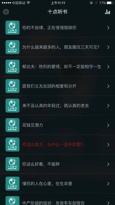 每晚十点听书,收获全新人生感悟。软件无内置广告,不强制评论,期待您的收听。