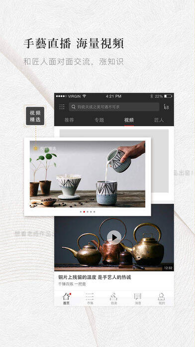4、内容:有匠人手艺直播,可边看边问边买;还有海量视频和内容,能跟着匠人增长知识。