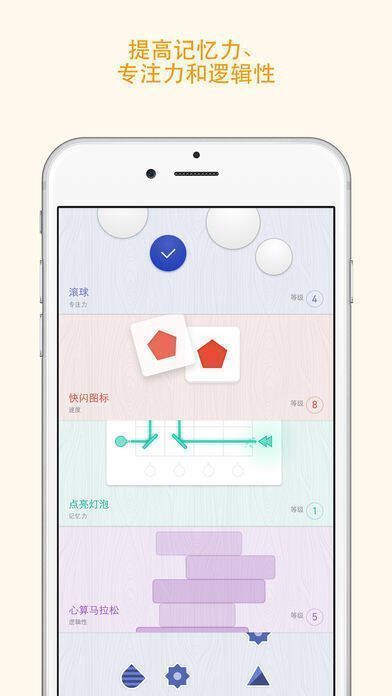 3、拥有15款游戏,共450个趣味关卡,可训练记忆力、逻辑性、专注力、反应力和速度这5大大脑功能。