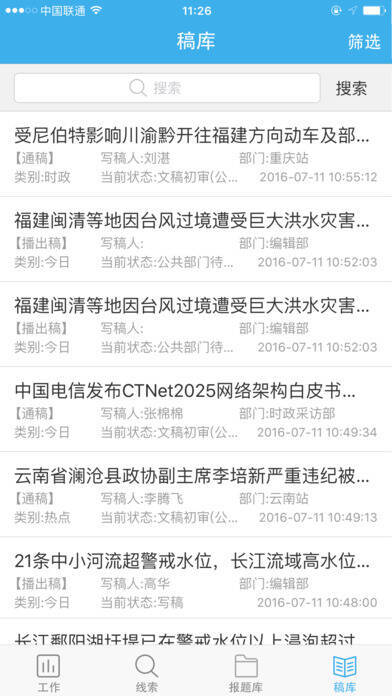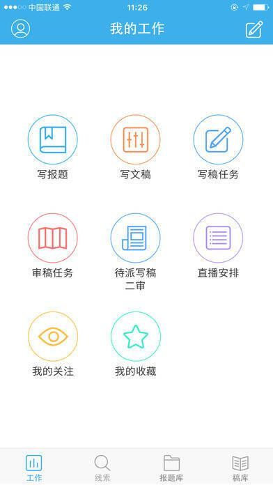 【我的工作】记者和用户可在线完成选题策划、稿件制作、文稿审核和评定以及查看直播安排等采编工作。