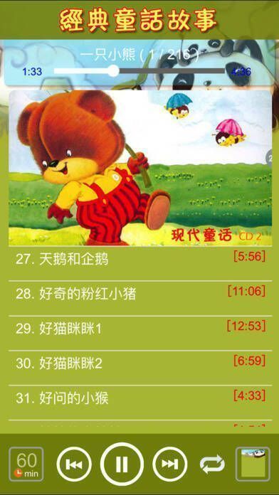 1、现代童话 CD 1:包含《一只小熊》《不守纪律的小闹钟》等众多故事。