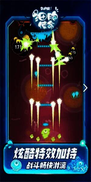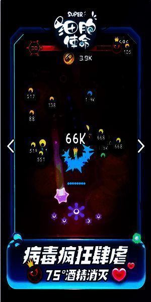 1、采用经典的闯关模式,玩家携带迷你细胞,在疯狂病菌肆虐的世界中,强力打击病毒,守护健康。