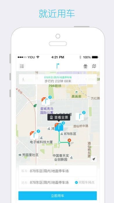 一度用车 app 是一款面向短时租车市场的手机租车应用。它与滴滴快的、Uber 等应用不同,推行分时租赁、易行零排理念,致力于打造绿色出行概念和新型汽车消费模式。用户能够就近查找网点并挑选心仪车型,所有车型均为环保型电动汽车,且租车按分钟计费,提车确认订单半小时后开始收费。灵活的租赁方式与便捷的借还途径,让用户用车更安心,是随时可用的代步好工具。