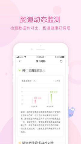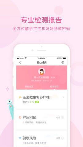 爱幼妈妈app专为妈妈们打造,通过独家的肠道微生物母婴共同检测服务为宝宝体检,并有专业健康管理方案预防疾病。专业生物和营养师团队提供解决方案,让宝宝健康成长有迹可循。