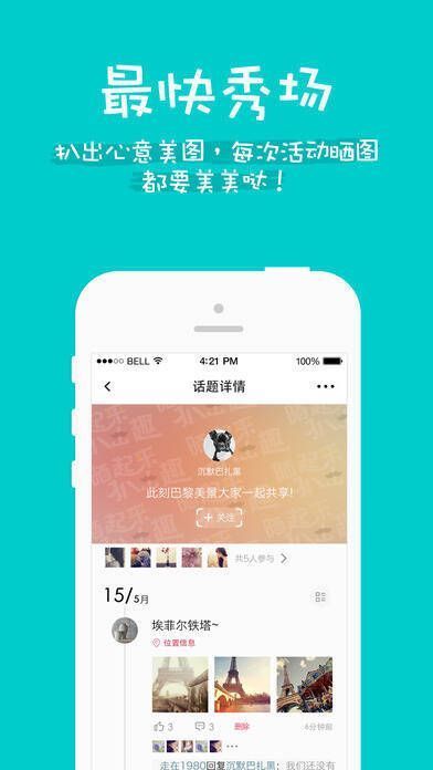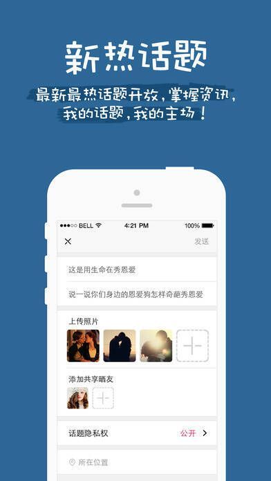 1. 借助LBS精准定位,精准推送附近话题,让你知晓身边大事并参与其中。2. 可一键创建话题,自由发掘话题,与好友共享甜蜜难忘时刻,还能随意设置多种权限添加好友。3. 每个话题有唯一二维码,朋友扫码就能快速加入话题并发布图片。