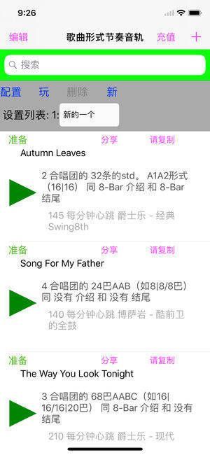无需进行繁琐的鼓循环序列和耗时的编程!你只需选择歌曲的节奏和形式安排,按下“保存”,就能获得一条高品质的、定制的节奏依托轨道。可以将其添加到你的演出曲目列表中,用于练习或表演。还能在应用内分享你和他人的歌曲选择。