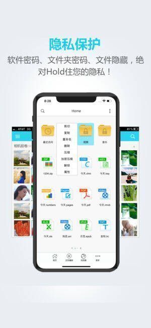 若有私密文件不想被他人看到,可设置软件密码,也能单独设置文件夹密码。拍了照片或视频想传回电脑,无需数据线,直接通过wifi无线传输。能通过文件全能王拍摄私密照片或视频,并按目录归类整理。还能通过蓝牙传文件给别的iPhone/iPod/iPad。可以压缩和解压缩各种zip和rar文件,用来保存邮件附件并解开,也能发送邮件附件。能在手机上轻松浏览word/exel/ppt/txt/page/number等各种文件,操作界面精心设计,一看就会。