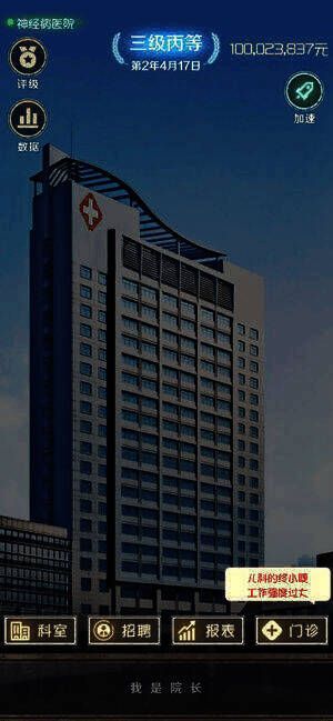 《我是院长》是一款模拟经营医院的手机游戏,游戏主要目标是让医院成为三级特等国际大医院。玩家需要合理招募、培养医生,扩建医院科室,不断做出抉择,才能经营好医院!快来《我是院长》游戏中亲自感受吧!