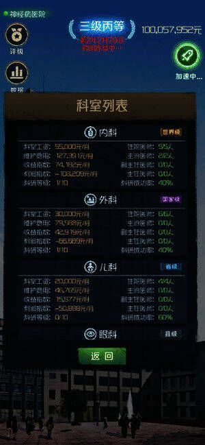 1. 游戏内科室分为县级、市级、省级、国家级、世界级五个等级,科室等级会影响病人数量和疾病等级,科室等级可通过扩建来提升。