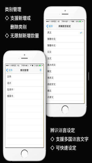 - 提供多国语言文字辨识功能,涵盖繁体中文、简体中文、英文、韩文、日文、意大利文、西班牙文、德文、法文、马来文、丹麦文等。