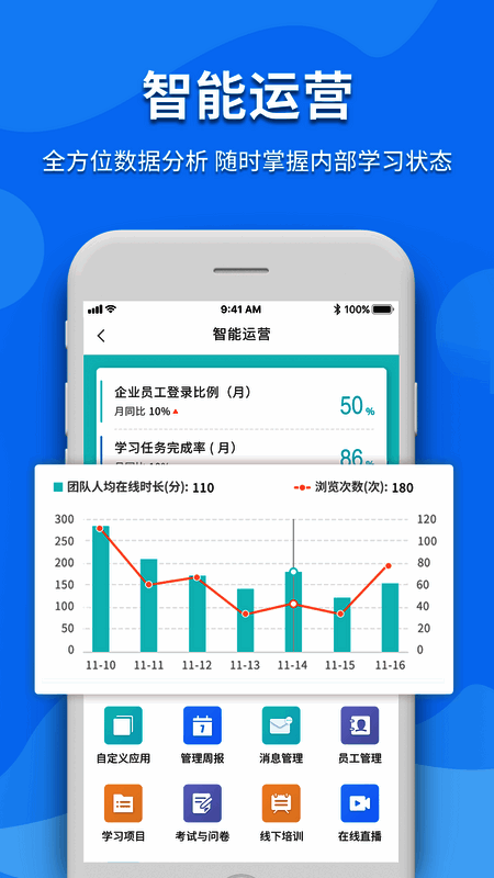 点击智能运营按钮,可查看企业内部员工的学习情况。