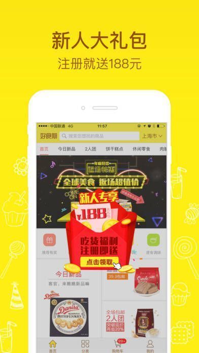 《好食期》app 是一款专注食品特卖的软件。它为用户打造了优质食物源,让大家足不出户就能买到特价商品。刚注册的用户可享 188 元福利。