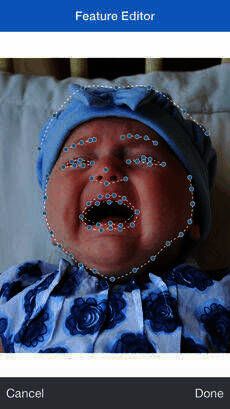 2、找出两张图片之间的相似点,即需要应用渐变过渡特效的地方(如两张脸各自的眼睛、嘴巴、耳朵等),在这些地方添加关键点(关键点的添加方法具体参看菜单栏 - 文件 - 打开演示中的变形例子),没有关键点的部位则自动处理为淡出淡入;