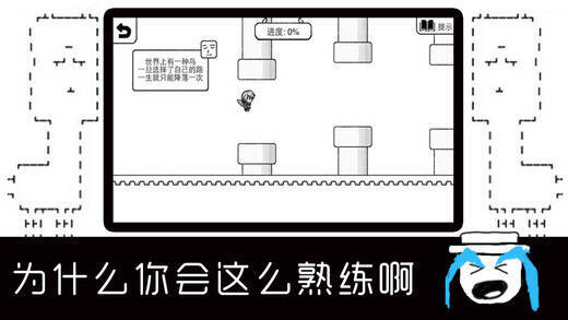 《变态的大冒险》是一款有着简约黑白画面的闯关游戏,风格诙谐幽默,难度堪称“变态”。若非拥有开发者般的脑洞,很难适应其关卡设计,往往能猜到开头却猜不到结尾。