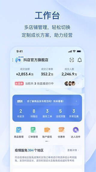 抖音小店苹果手机版是专门为 TikTok 商店开店打造的便捷办公工具。用户能够灵活挑选所需功能,高效完成各类业务。它不仅提供了一个全面的移动工作空间,还能直接查看各类信息,助力企业轻松管理店铺。作为抖音电商的得力助手,它集选品、搬运配送、数据分析等功能于一体,适用于抖音门店在抖音盒、巨量引擎、巨量千川等平台开展门店运营、商品管理、选品分析等工作。依据供应商、抖音商家、网红等不同角色的需求,提供端到端的产品数据服务,并通过智能算法推荐潜在爆款产品。