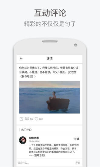 其交互操作精简,UI设计简洁大方,重新定义了句子应用。这里满是严肃、励志、唯美、心动、伤感等各类句子,愿你每日邂逅赏心之语、悦目之图,天天好心情。
