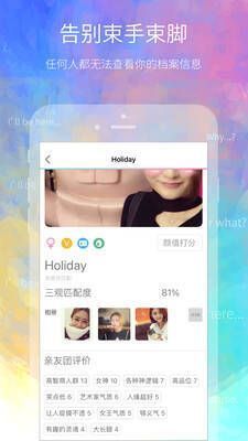 【个人资料他人不可见】让你摆脱束缚,个人年龄、身高、学历等资料都不会被他人看到。【实时双向匹配】告别手动查找,系统自动匹配最合适双方的人。【条件要求完全自定义】不用大海捞针,可根据自身要求和喜好精准匹配。【聊天辅助系统】避免尬聊,启用后系统根据双方共同点或潜在话题点给出暗示。【歌单匹配】找到歌单相似、兴趣相投的人。
