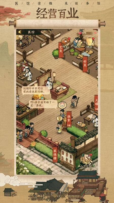 玩家要经营客栈来赚取财富,在门派脚下开设客栈,招待天下英雄。同时招收弟子,壮大自己的门派,增强宗族实力。游戏拥有精致的屏幕设计,尽显武术元素。