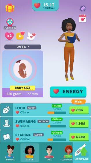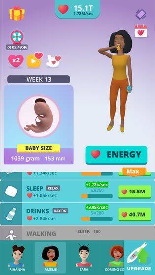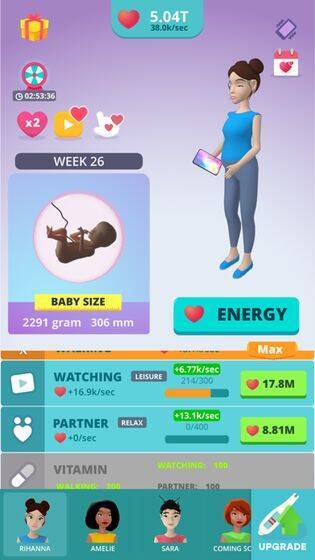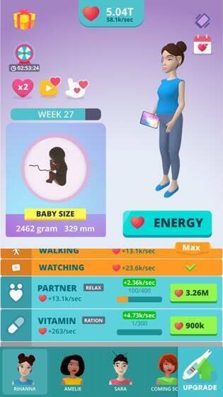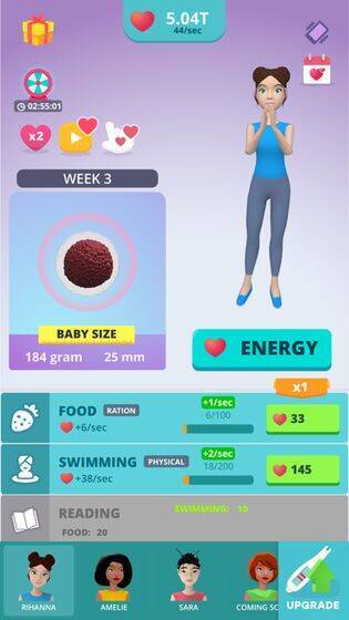 您要通过了解所有准妈妈的怀孕规则来提升自己,顺利迎接宝宝诞生。别偷懒哦,升级并填满游戏进度条,通过睡眠、散步、服用维生素等行动开启新的一周。在这个母亲模拟器中尝试全新角色吧!
