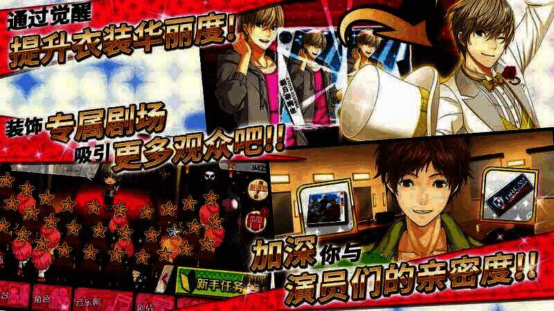 在游戏中,玩家将化身为剧本编剧,加入“梦色剧团”,和7名外型、个性各异的男演员一起发展音乐剧。这7位男演员风格外形各有特色,有的清纯,有的清冷,有的优雅,有的可爱。他们的喜好和害怕的东西也各不相同,玩家需根据他们的喜好“对症下药”,打造自己的天团。
