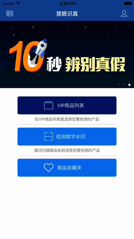 1、主界面直接为用户提供了vip商品列表、检测数字水印、商品收藏夹三大功能。
