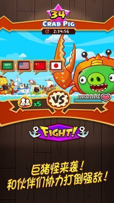 4、巨猪怪来袭!和伙伴一起打倒强敌!冒险中会遇到强大的巨猪怪,需增强小鸟战斗力迎接挑战,还能和全球玩家联手对抗,打败它有机会得稀有装备。