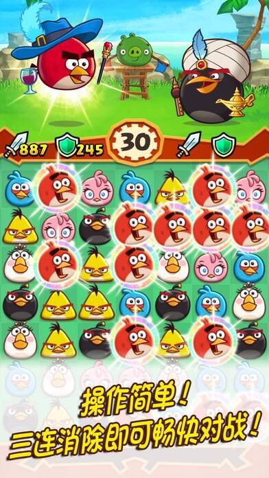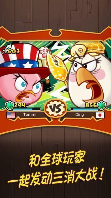 三消对战易如反掌!只要纵向或横向凑齐三只相同小鸟就能消除,持续消除来攻击对手,与全球玩家实时对战!后续稀有角色和巨猪怪会陆续登场,快来和愤怒的小鸟开启大冒险!